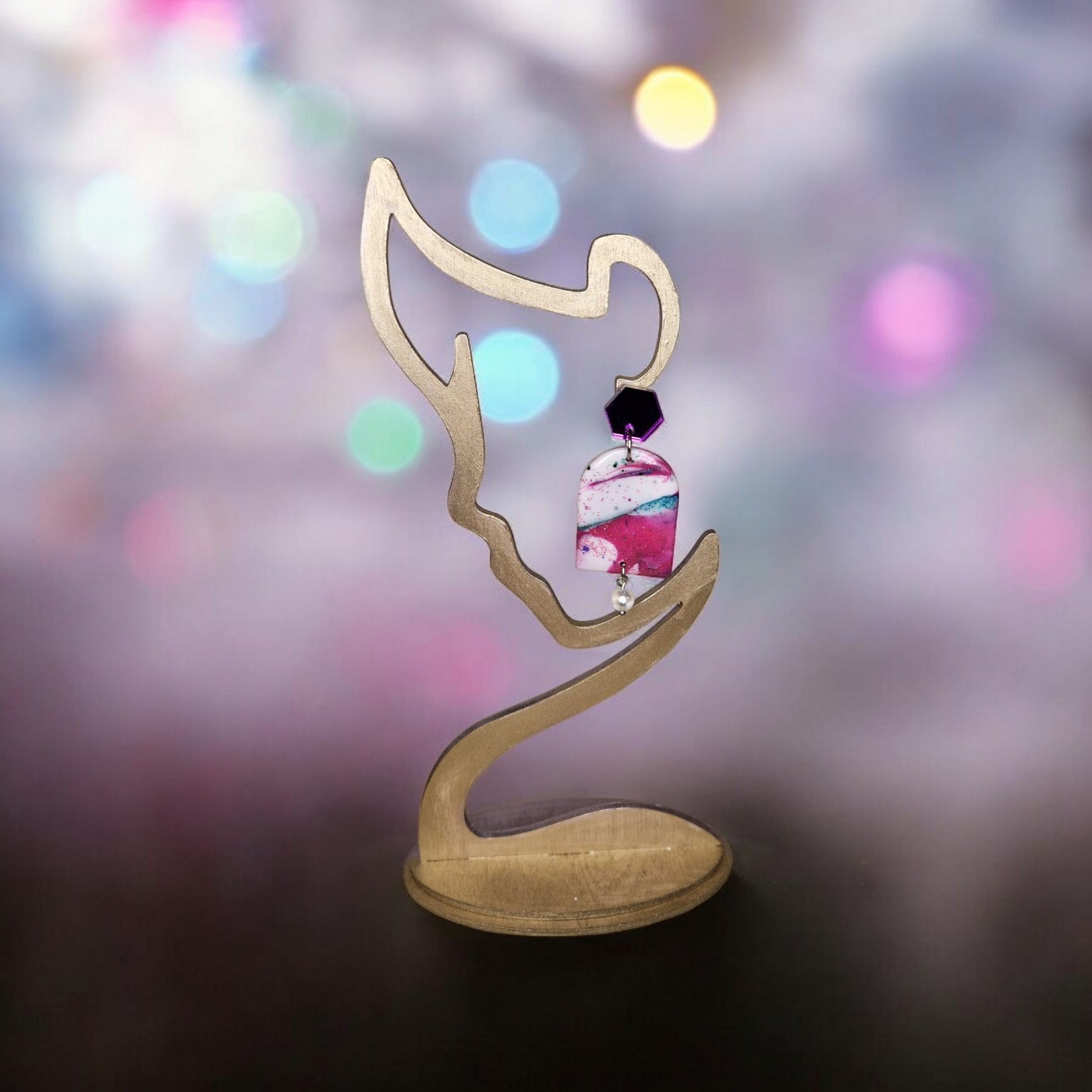 Materiaaleina polymeerimassa, peiliakryyli ja lasihelmet.